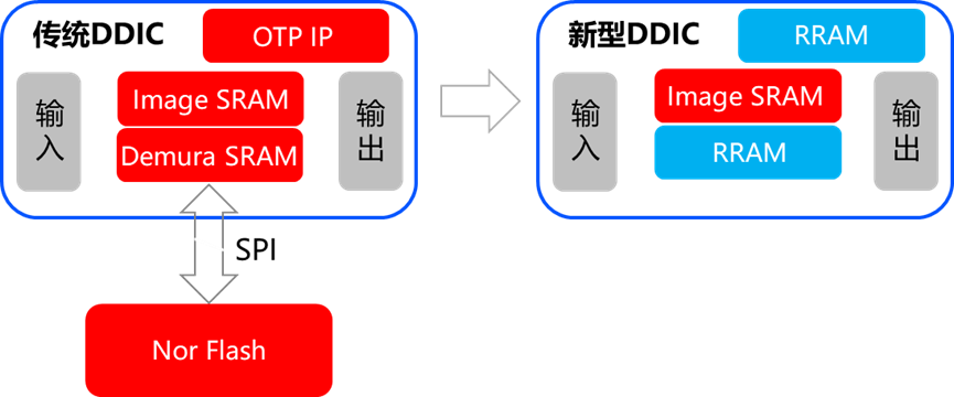 2.面积更小:和NOR Flash相比,RRAM可微缩到10纳米以下,能直接嵌入到40纳米的AMOLED显示驱动芯片内部,可缩减性更优异。此外,RRAM同时可取代芯片内部的Demura SRAM和OTP,相比SRAM存储面积可缩减30%,为其他性能的提升如亮度补偿腾出空间,为整机优化设计带来更多可能;而同等面积下,RRAM方案相较SRAM存储数据量可增加30%,意味着对Demura补偿效果更好,显示效果更佳。